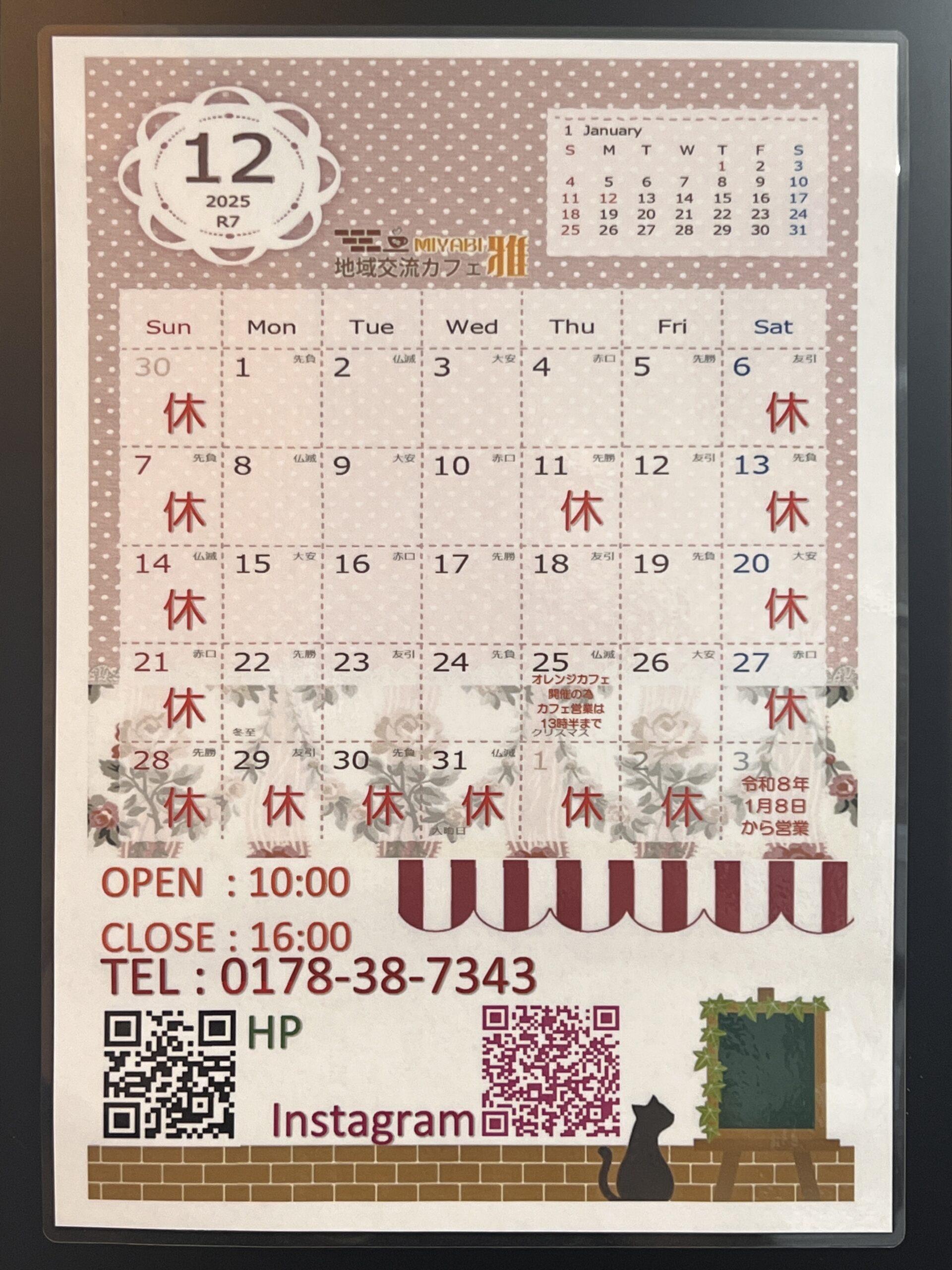 11日(木)は臨時休業となります。 25日(木)はオレンジカフェ開催の為13時半までの営業となります。 年末年始は12月27日(土)から令和8年1月7日(水)までお休みいたします。