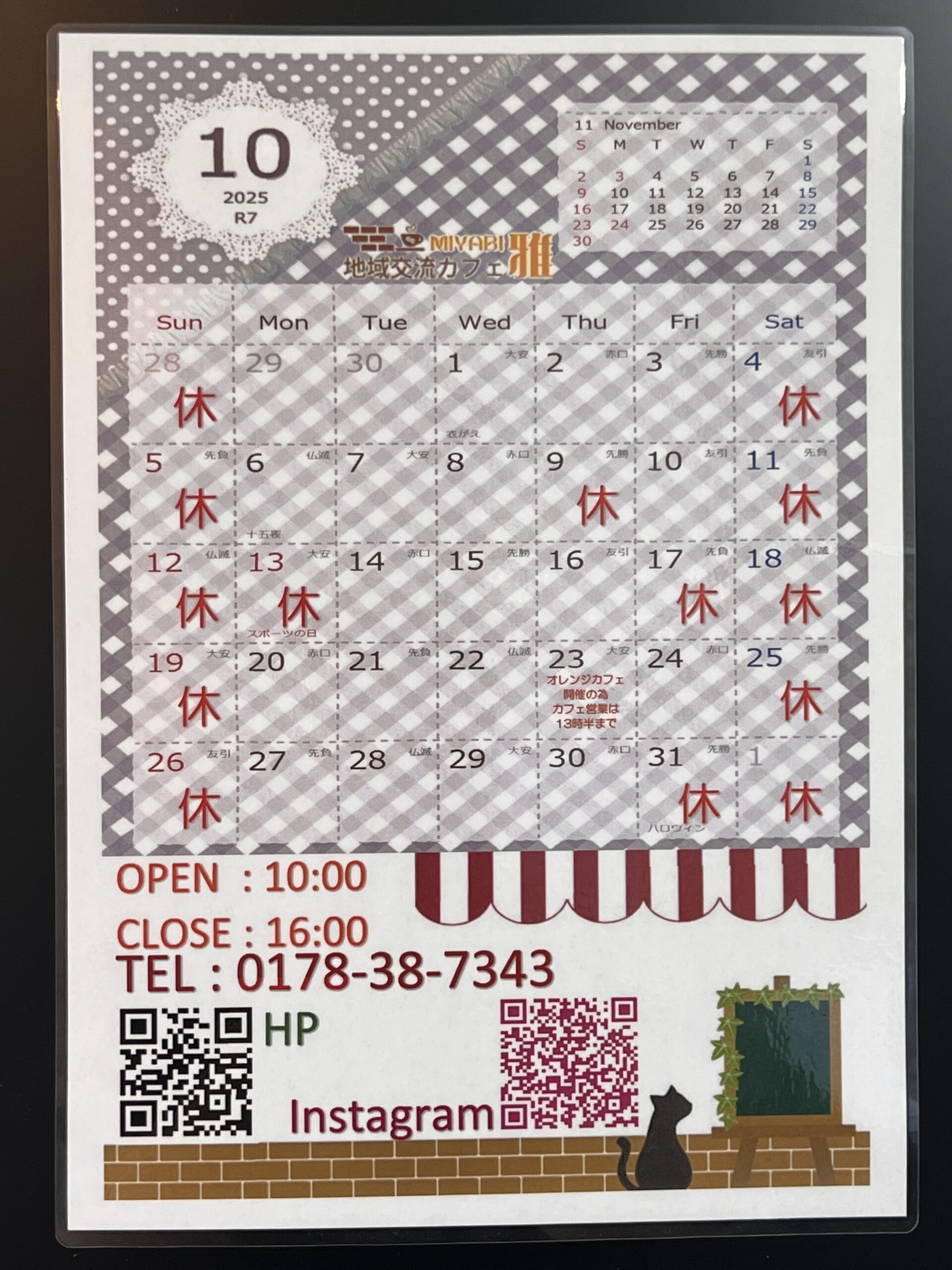 9日(木)、17日(金)、31日(金)は都合により臨時休業いたします。 23日(木)はオレンジカフェ開催の為、13時半までの営業となります。 その他、土日祝日は定休日となっております。