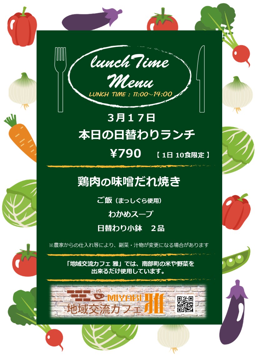 地元南部町の契約農家から届く米や新鮮野菜を使用した